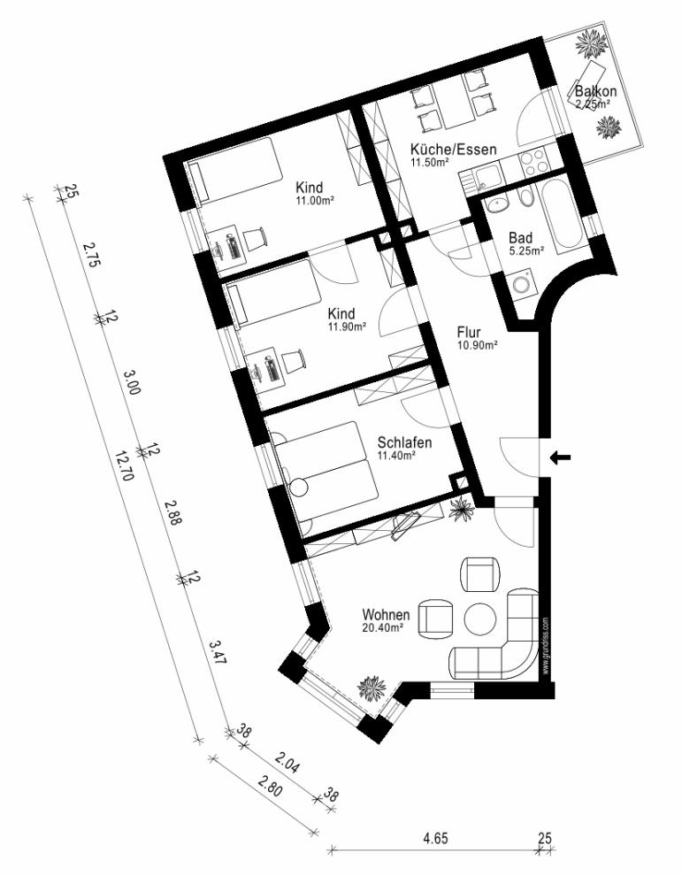 Die Wohnung (2.OG links) verfügt über ein Bad mit Wanne (gefliest, Fenster), eine Wohnküche mit Balkon (in Richtung Grünanlagen und Innenhof), ein helles geräumiges Wohnzimmer, Schlafraum und zwei Kinderzimmer (Fenster jeweils zur Seitenstraße). In Küche und Bad sind CV-Belag verlegt. Gegen einen Aufpreis von 28,50 € monatlich wird in der gesamten Wohnnung Belag verlegt.