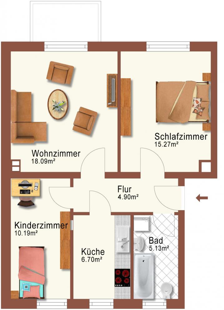 Die Wohnung befindet sich im 1. OG und verfügt über eine Küche mit Fenster, ein Wohnzimmer mit Balkon, ein Bad mit Wanne (gefliest, Fenster), Flur, Abstellraum, Kinderzimmer sowie einen Schlafraum.